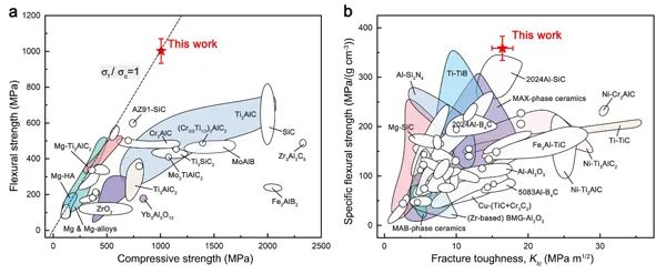 图2:镁-MAX相仿生金属陶瓷的力学性能及其与其他材料的比较