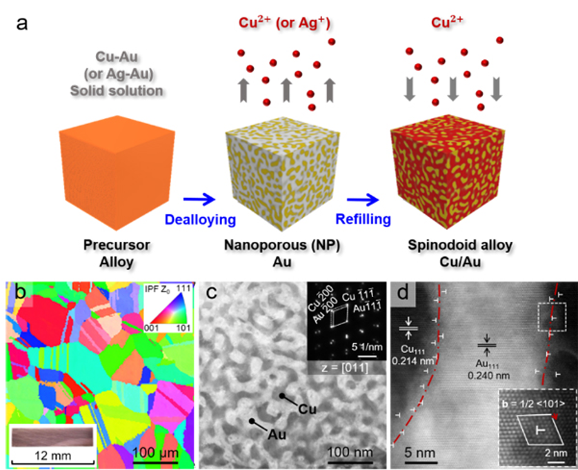 图1. 仿调幅分解结构Cu/Au合金的制备及结构特征。a) 脱合金与电沉积结合形成仿调幅分解结构的示意图。b)EBSD照片显示该材料粗大的晶粒尺寸,c)TEM照片显示其双连续纳米双相结构,以及d)HRTEM照片显示半共格界面和高密度失配位错。