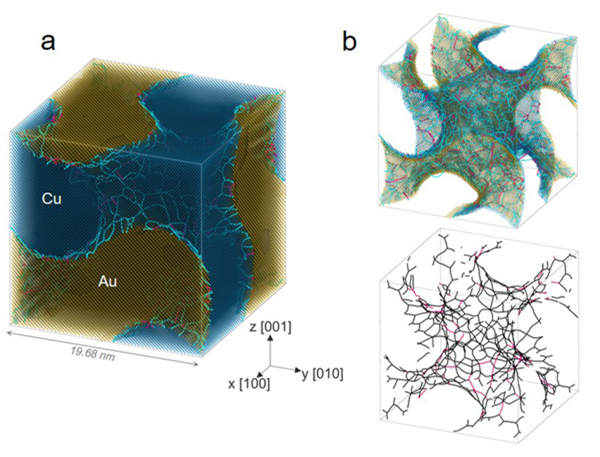 图2. 仿调幅分解结构Cu/Au合金的分子动力学模拟。a)典型 Gyroid双相结构及其光滑连续半共格界面,以及b)界面上大量失配位错组成的三维位错网络。