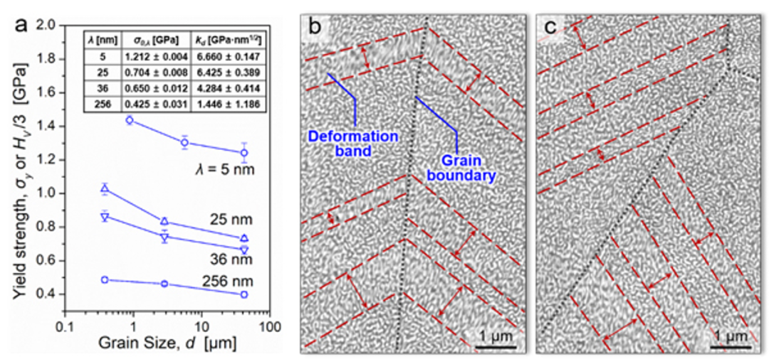 图4 仿调幅分解结构Cu/Au合金屈服强度的晶粒尺寸效应。a)虽然该材料晶粒尺寸(d)比结构尺寸高几个数量级,其强度仍表现出显著的晶粒尺寸(d)效应。(b-c)SEM照片显示晶界对剪切带有明显的阻碍作用,与强度的晶粒尺寸效应相一致。