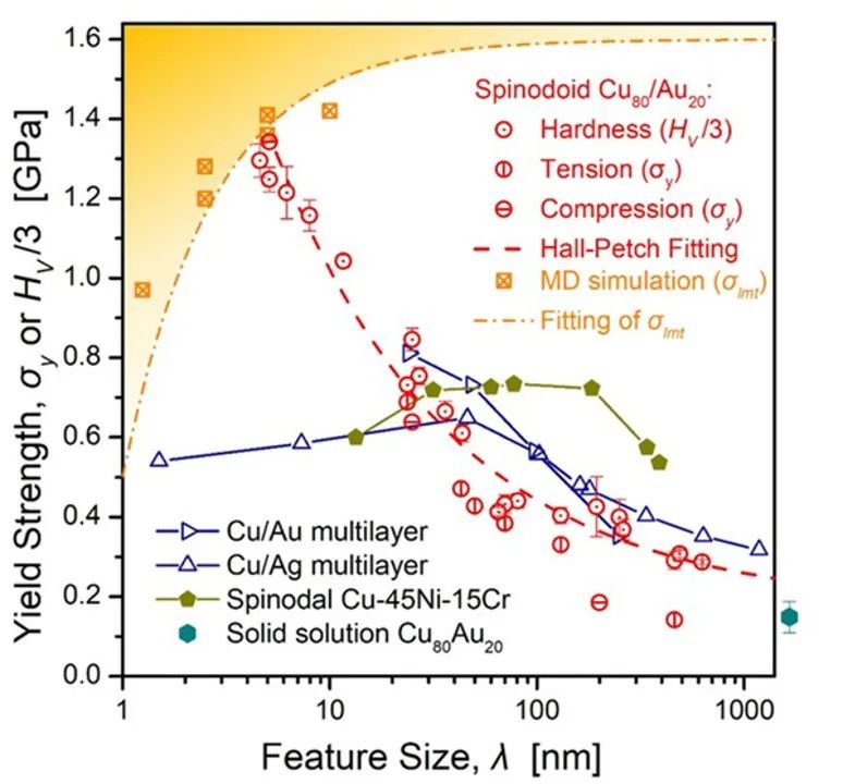 图3. 仿调幅分解结构Cu/Au合金屈服强度的特征结构尺寸效应。其强度随结构尺寸减小而持续上升,并逼近理论计算的理论强度。