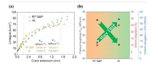 图6.IA和RT Q&P钢的力学性能,(a)来自每种钢的两个代表性样品的断裂韧性数据,(b)拉伸和断裂性能比较的示意图。