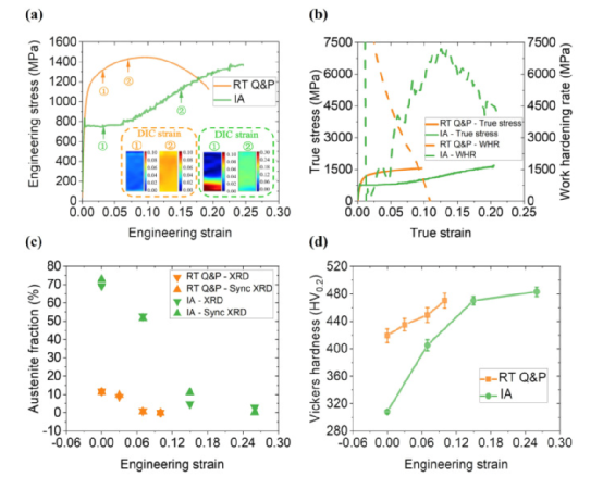 图3 .IA和RT Q&P钢的拉伸行为,(a)工程应力 - 应变曲线,DIC结果在插图中应变,(b)真实应力 - 应变和加工硬化速率曲线,(c)奥氏体部分,(d)拉伸期间的维氏硬度演变。