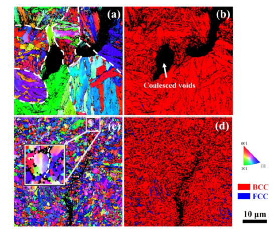 图8 .IA和RT Q&P钢的裂纹增长行为,(a)IPF,(b)RT Q&P C(T)样品的相图,(c)IPF和(d)IA C(T)样品的相图。(a)中的白色虚线代表PAGB,(c)插图中的白色虚线代表裂缝增长路径。图例和比例尺位于右下角。