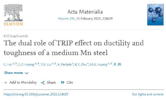 制造用于汽车应用的轻量化结构一直是一项追求,实现这一目标的有效方法是采用先进高强度钢(AHSS)。除了高强度外,断裂韧性对于结构材料也是必不可少的。然而,这两种理想的性能对于大多数结构材料(如钢)来说是相互排斥的,这种固有的冲突是众所周知的强度-韧性权衡。这种矛盾可以通过考虑钢的强化旨在阻止或抑制各种缺陷的位错滑行来理解,这将不可避免地诱发应变定位甚至引发微裂纹。因此,这些加固方法不适用于抗断裂性至关重要的应用。另一方面,对钢断裂韧性的主要贡献来自裂纹尖端附近的位错活动。这种机制导致了一个普遍但不幸的结论:具有较高强度的钢将具有更有限的位错运动,因此断裂韧性较低。