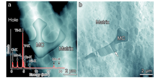 尽管几十年来一直在研究高温合金中MC碳化物的分解,但其原子机制仍然知之甚少。通常认为化学分解始于MC碳化物和基体的界面,经典分解反应为:MC+γ→M 6C/M23C6+γ′/η。 高温合金中MC的其他不同变性反应也报道了不同的合金成分,特别是取决于合金的Nb/Ti和(W + Mo)/Cr比率。退化产物从M6C 到 M 共存6C 和 M23C6最后到M23C6,合金的(W + Mo)/Cr比从0.55降低到0.37,最后降低到0.22。然而,此后大多数MC分解研究都集中在MC在热暴露过程中的微观结构演变上,目前对高空间分辨率下初级MC分解的认识有限。需要有关微观结构特征的原子尺度信息,例如分解位点和位错机制,以了解碳化物在高温下蠕变变形过程中的分解行为。