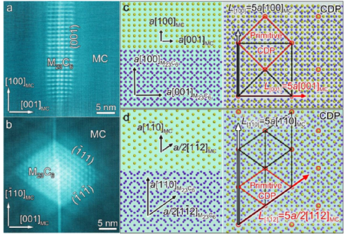 图3(a) 明场图像显示晶粒内部的MC碳化物,以及MC碳化物中存在的缺陷。(b,e,f)[010]司仪, [110]司仪和 [111]司仪分别。(c) 示意图对应于(b),其中红色和蓝色斑点表示来自MC和M的反射23C6分别。(d) 显示M降水的ADF图像23C6沿着MC内部的缺陷沉淀。