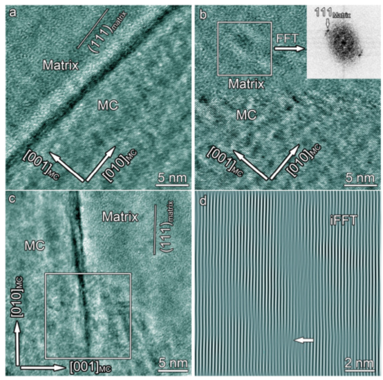 图8 铸态试样的MC与基体之间的界面沿[100]基体带轴观察。(a)和(b)高分辨率图像分别显示一个平坦的(001)MC-(111)矩阵界面和一个不直的界面。(b)中插入的快速傅里叶变换(FFT)模式表示(001)MC//(111)矩阵。(c)和(d)显示了框架区域的MC和快速傅里叶变换(iFFT)反模式的缺陷。