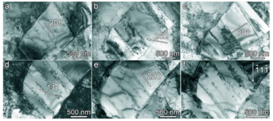 图5 MC碳化物中缺陷的形态。蠕变变形后高温合金基体中MC碳化物缺陷的亮场图像(a) 200, (b) 20, (c) 002, (d), (e) 20和(f) 1。光束方向为:(a, b, c) [010]MC和(d, e, f) [110]MC。