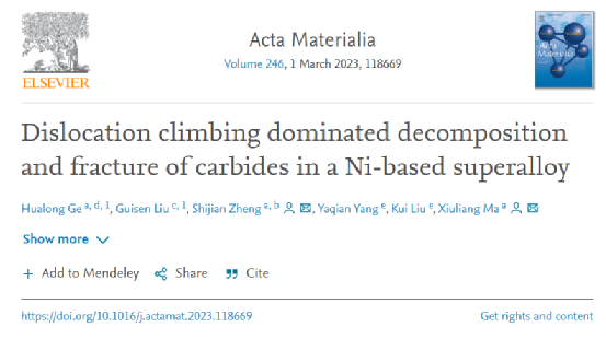 相关研究成果以题为Dislocation climbing dominated decomposition and fracture of carbides in a Ni-based superalloy发表在Acta Materialia上。