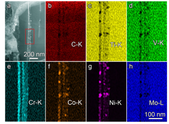 图2 MC碳化物中的元素不均匀分布。(a) HAADF图像显示MC碳化物的不均匀区域。在MC硬质合金上执行的EDS图,包括以(a)框框的矩形的非均匀区域:(b)C-K,(c)Ti-K,(d)V-K,(e)Cr-K,(f)Co-K,(g)Ni-K,(h)Mo-L。
