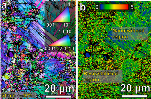 图14. .类型 1 样本的典型 EBSD 映射。(a)定向和(b)局部应变为~40%的KAM图谱。