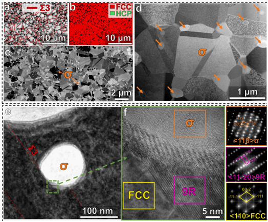 图5,.在拉伸变形之前,在 800 ◦C 下退火 30 分钟(2 型)的完全重结晶样品的微观结构分析。(a)具有生物或生物意义的海洋生态系统障碍图像质量图,突出显示细粒度区域的Σ3 孪生边界和(b)相位图。(c)细粒度区域的ECC图像。(d)细粒度的HAADF-STEM图像地区。(e)明场透射电镜图像和(f)西格玛相位、9R结构和FCC矩阵的高分辨率透射电镜图像。相应的FFT模式显示在右边揭示了方向关系。“σ”是指西格玛阶段。