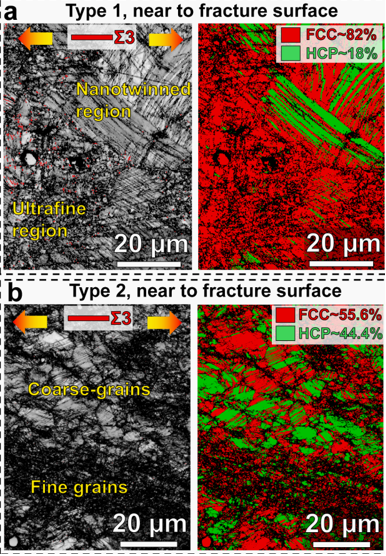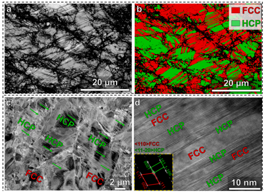 图9. .在800°C下退火的样品粗晶区域中的变形微观结构(2型)。(a)和(b)EBSD图像质量和相位图2型样品的断裂表面附近的粗粒区域(局部应变~60%)。(c) ECC图像显示FCC矩阵中的HCP相位。(d)高分辨率拉伸变形后粗晶区域的TEM图像和相应的FFT图谱。