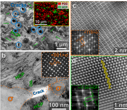 图10. .退火样品细晶区域中的变形微观结构800 ◦C(类型 2)。(a)具有局部应变的细粒度区域的 ECC 图像 ~60%类型 2 样品;插图是对应的EBSD阶段图;裂缝由浅蓝色圆圈。FCC 和 HCP 阶段是以红色和绿色突出显示。(b)裂解区域的明场透射电镜图像西格玛阶段。插图是 SAED 图案裂缝附近的西格玛相。(c)和(d)高分辨率HAADF-STEM图像裂缝附近的西格玛和HCP相位。"σ"指西格玛阶段。