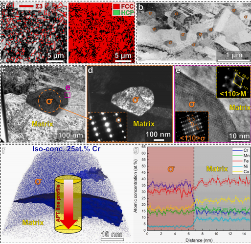 单相高熵合金(HEA)近年来因其具有吸引力的特性而受到关注,例如优异的强度-延展性组合,高耐腐蚀性和耐辐照性强。然而,据观察,脆性在康托尔型FeMnCoCrNi中沿晶界形成西格玛相中温退火后的高熵合金。西格玛相颗粒通常会导致室温下延展性丧失以及抗氧化性降低和合金基体的有效强度。例如,降水σ相导致面心立方(FCC)基合金的整体机械性能下降,其中拉伸损失在基于FeMnCoCrNi的高熵合金中观察到延展性(~75→0.5%)和室温下的不锈钢(~150→20%)。这种韧性的大幅降低是设计中的主要问题。