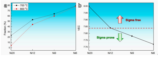 图12.Fe40-xMn20Cr20Co20Nix合金体系中预测的σ相数据(在%;x=20,12,9和6)合金体系中。(a)在平衡状态下退火后各种高熵合金的相热力学稳定西格玛的体积分数。(b)各种退火高熵合金的VEC合金成分图。绿色和红色箭头表示退火后分别不存在和存在西格玛相。