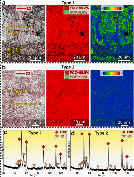 综上所述,在这项工作中,我们展示了一种结合缓解阶段的方式来转化结构,以操纵含有脆性西格玛相的典型非等原子FeMnCoCrNi HEA的机械性能。我们观察了两种类型的微观结构:i)具有纳米孪晶和超细晶粒区域的1型; ii)具有粗粒和细粒区域的 2 型。1型样品在700◦C下退火30分钟,连接效应由反向相变和超细引发的纳米孪生由纳米尺寸的西格玛颗粒稳定的晶粒,极大地增强非等原子FeMnCoCrNi HEA,实现产量和最终中等时的抗拉强度分别为~1040和~1280 MPa,总伸长率(~27%)。在退火率较高时, 2 型样品中温度(800◦C30分钟),消融转化更多在粗粒和细粒区域积极促进(~44.4 vol.%)。转变在延迟甚至抑制裂纹成核和西格玛相的扩展进入矩阵,形成高断裂强度和延展性(~1130 MPa 和 ~50%)。