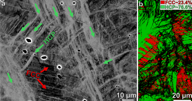 图1所示。均质加冷轧后Fe36Mn20Co20Cr20Ni6(at.%)HEA的微观结构分析。(a) ECC图像和(b)EBSD相位图。