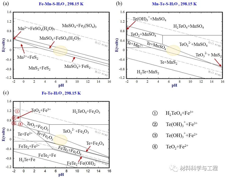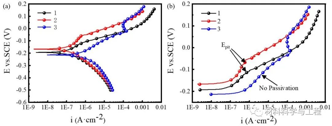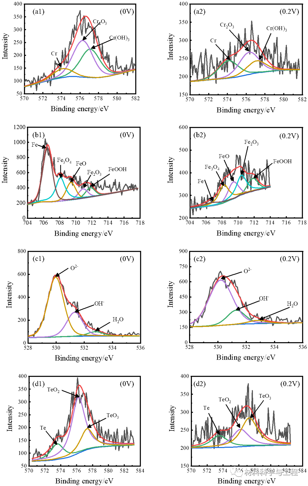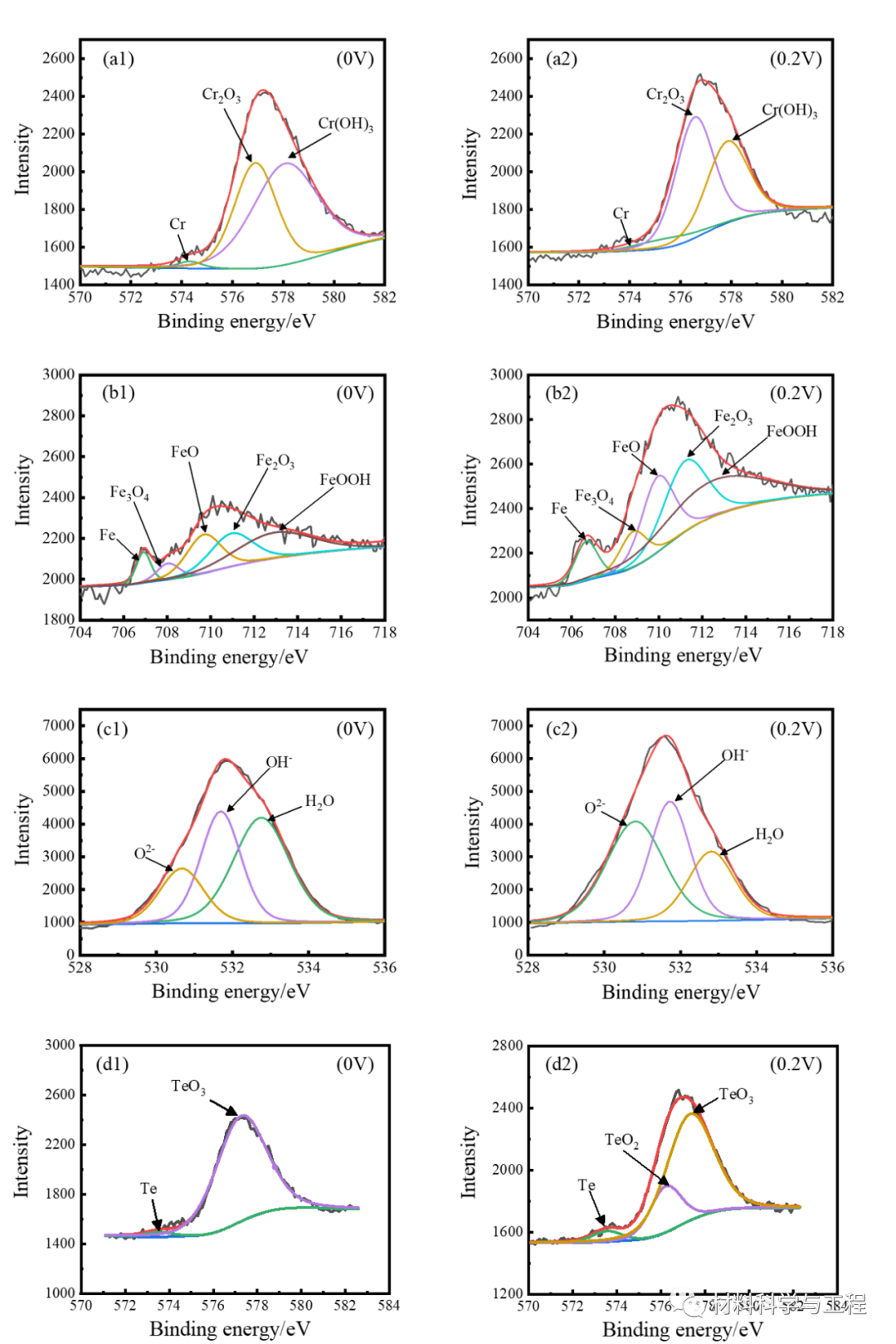 15-5PH不锈钢具有较高的强度和韧性,广泛地应用于航空航天、核工业等高科技行业。然而,15-5PH不锈钢中夹杂物的存在严重影响了其耐蚀性,限制了其在实际中的使用寿命和安全性。MnS是15-5PH不锈钢中的典型夹杂物,通常为钢材局部腐蚀的起始位置。据报道,钢中加入Te可以有效对MnS进行改性。不锈钢中添加Te后会形成Te-S-Mn复合夹杂物。钢中夹杂物的电化学特性与夹杂物诱导局部腐蚀的机理直接相关。然而,目前关于Te对不锈钢的耐腐蚀性能和局部腐蚀机理影响的研究仍然缺失。北京科技大学李晓刚教授团队联合李京社教授团队,通过微合金化对15-5PH不锈钢中的夹杂物进行了调控。并在模拟海洋环境中研究了Te对15-5PH不锈钢腐蚀机理的影响规律。Te元素调控有效改善了钢中MnS夹杂的成分、形态和数量。微区电化学性能测试结果证实了MnS和钢基体之间的电偶腐蚀作用,表明MnS以电化学溶解的方式诱发点蚀的萌生添加Te元素后,形成的含Te复合及杂物的表面电势发生显著改变,且具有良好的导电性,改变了点蚀萌生机理。适量添加Te元素可提高钢材耐蚀性能。然而,由于夹杂物中含Te部分的持续阴极效应,以及大量TeO3的溶解对钝化膜稳定性地破坏,过量添加Te会导致耐蚀性能的退化。相关研究成果以题为“Mechanism of the dual effect of Te addition on the localized corrosion resistance of 15-5PH stainless steel”发表在《corrosion science》上。https://www.sciencedirect.com/science/article/pii/S0010938X23000124采用FE-SEM-EDS对不同样品中的夹杂物进行了表征(图1)。适当添加Te,钢中尺寸较小的夹杂物明显增多,有效降低点蚀形核率,提高钢材耐腐蚀性能。过量添加Te导致钢中形成较大尺寸的复合夹杂物。在嵌入夹杂/基体界面的Te与基体之间的电偶效应以及侵蚀性溶液环境的耦合作用下,暴露在凹坑中的新鲜基体会迅速溶解,导致钢材耐腐蚀性能衰减。图1 (a)-(b)1#,(c)-(d)2#,(e)-(f)3#,(g)MnS-Te的三维形貌,(h)1#,2#,3#夹杂物的尺寸分布,(i)1#,2#,3#夹杂物的密度分布。利用SKPFM和CSAFM检测了MnS-Te复合夹杂物的局部电化学信息(图2)。含Te复合夹杂物中,Te增加了夹杂物的Volta电位,改变了局部腐蚀机理。夹杂物和基体表现出良好的导电性,MnS-Te夹杂物与钢基体之间存在三对电偶。图2 MnS-Te夹杂物的SKPFM和CSAFM测试结果,(a)MnS-Te形貌和EDS图,(b)AFM形貌,(c)SKPFM图,(d)CSAFM图,(e)在(a)相同区域的AFM线轮廓分析极化曲线测试表明适量添加Te提高了钢材的耐蚀性(图3)。过量添加Te,材料表现出活化性能,说明过量添加Te减弱了钢材的耐腐蚀性能。图3 室温下15-5PH马氏体不锈钢在1wt.%NaCl中的电位极化曲线,(a)极化曲线,(b)阳极极化曲线在晶界处聚集的Te和夹杂物中含有的Te导致钢表面形成含Te钝化膜。钢中加入过量的Te后,钝化膜中生成大量的TeO3,这可能导致钝化膜的分解。随着溶解的进行,Te的氧化物含量减少,钝化膜的溶解速率降低。因此,3#钢的曲线产生了波动。图4 2#的XPS峰分布,在不同电位下形成钝化膜:(a1–a2)Cr2p3/2;(b1–b2)Fe2p3/2;(c1–c2)O1s;(d1–d2)Te3d5/2图5 3#钝化膜在不同电位下的XPS峰分布:(a1–a2)Cr2p3/2;(b1–b2)Fe2p3/2;(c1–c2)O1s;(d1–d2)Te3d5/2适量添加Te形成了小尺寸MnS-Te夹杂物,MnS优先溶解在阳极相中。在MnS完全溶解后,Te从钢基体中释放出来并进入溶液中。过量添加Te降低了15-5PH不锈钢的耐蚀性,这是由于复合夹杂物中Te的持续阴极效应促进了基体的腐蚀。图6 (a)1#,(b)2#,(c)3#中不同夹杂物在浸泡不同时间(1)10min,(2)30min,(3)90min后局部腐蚀形貌的FE-SEM-EDS图像图7 夹杂物局部腐蚀过程示意图:(a)MnS,(b)MnS-Te图8 利用FactSage软件计算了(a)Fe-Mn-S-H2O,(b)Mn-Te-S-H2O,(c)Fe-Te-H2O体系在298.15K时的布拜图