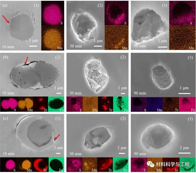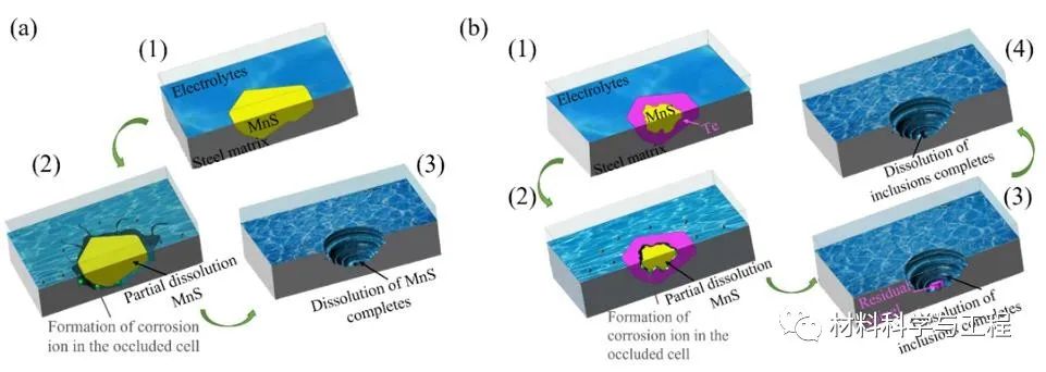 在本工作中,研究了Te对15-5PH钢局部腐蚀机理和耐蚀性的影响。MnS-Te复合夹杂物在钢基体中表现出良好的导电性能。Te、MnS和钢基体之间形成了3对电偶,Te改变了MnS夹杂物诱发点蚀的机理。适量添加Te可以提高15-5PH不锈钢的点蚀电位和耐蚀性能,过量添加Te削弱了钢的耐腐蚀性能。随着Te含量的增加,钝化膜中Te的氧化物含量增加,这可能导致钝化膜容易分解。过量添加Te,复合夹杂物中Te的持续阴极作用降低了15-5PH不锈钢的耐蚀性。