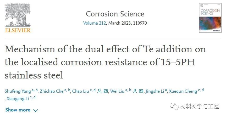 北科大《Corrosion Science》:Te对15-5PH不锈钢耐腐蚀性能的双重影响机制!