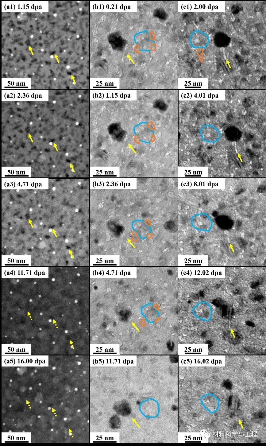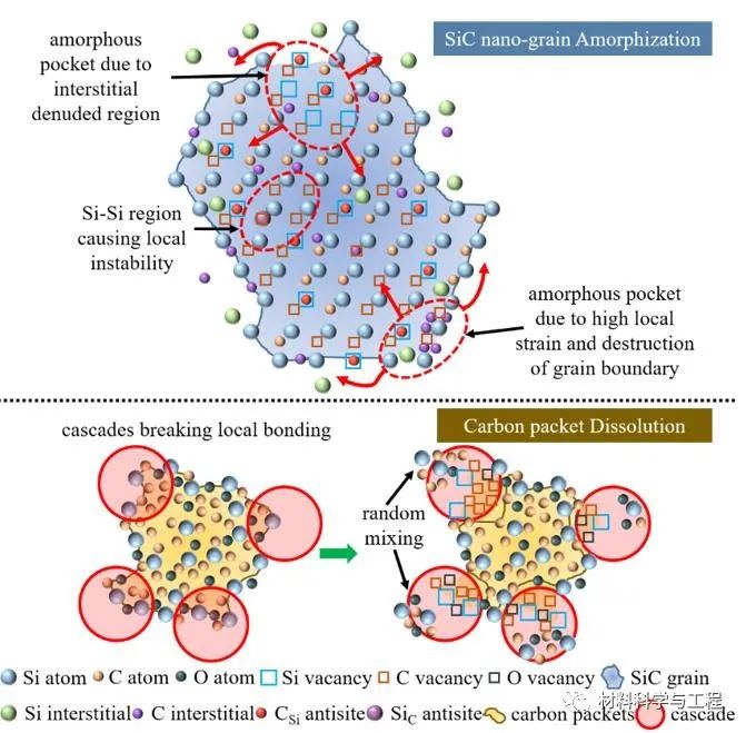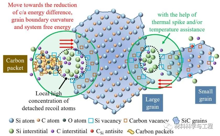 图3 国产SiC纤维的非晶化过程。纳米晶因贫间隙原子区和晶界处大量原子聚集重排而形成非晶包,非晶包沿非晶/结晶界面扩展,侵蚀晶粒。碳包所含原子在级联下被剥离,并移动到晶界处或在级联内均匀混合,转变为完全非晶状态。图4 国产SiC纤维在300 ℃和800 ℃经800 keV Kr离子辐照的STEM-HAADF和BF TEM图像。(a1–a5)为碳包逐渐消失的过程;(b1–b5)和(c1–c5)分别为晶粒在300 ℃和800 ℃侵占原属于碳包位置的过程。图5 国产SiC纤维的晶粒长大过程。晶粒和碳包中的原子通过位移级联和/或热激活从其原始位置分离,并积聚在缺陷阱处,导致局部高原子浓度。由于原子浓度梯度作用,这些分离的原子将离开,并向着可以减小c/a相能量差、晶界曲率、晶粒/碳包系统自由能的方向移动,其活动能力由热峰和/或高温提供。李晓强教授是国家级人才,其团队长期从事反应堆结构材料优化制备、评价考核、服役寿命评估和反应堆安全(重大事故预防缓解)的研究。目前牵头承担了国防科工局核能开发项目——SiCf/SiC复合材料ATF燃料元件关键技术研究,致力于推动陶瓷基复合材料在先进核能系统中的应用。欢迎具备相关研究背景的博士后和青年人才踊跃加入团队。