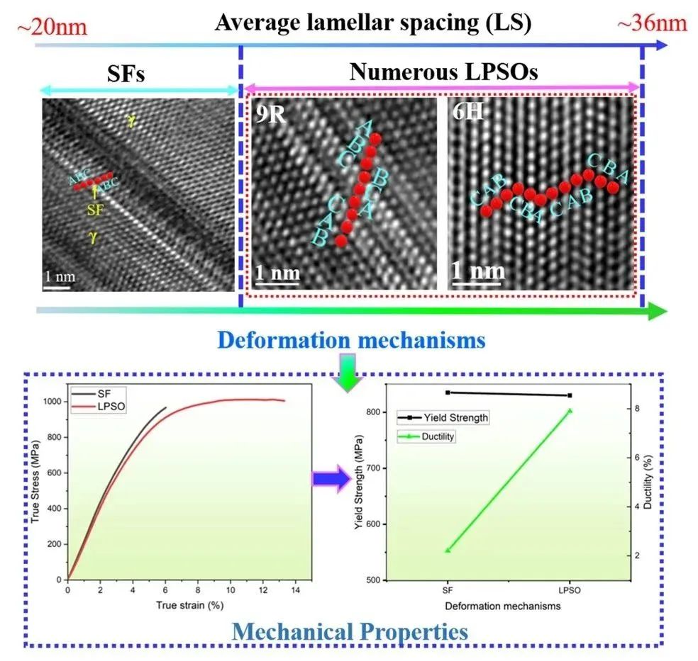 TiAl合金是非常有前景的航空航天材料,有望在650~900℃替代镍基高温合金制备航空发动机叶片、航天飞行器蒙皮、舵翼等关键耐高温部件。在TiAl合金的四大典型微观组织中,片层组织(LM)最具工程应用价值。根据Hall-Petch公式,片层间距(λ)越小,合金的室温和高温屈服强度越高。通常,片层组织的塑性变形主要通过位错滑移或孪晶进行。但随着λ下降到纳米级时,片层组织的变形机制将发生转变,引发不同的力学响应。 上世纪90年代以来,国内外学者在大塑性变形的TiAl合金中偶然发现了长程堆垛有序(LPSO)结构,如9R和6H等,被认为是纳米片层的一种新的变形机理。LPSO的形成对λ非常敏感,仅在几十纳米的片层中才能发生。探索LPSO对TiAl合金力学性能的影响具有重要意义,同时也非常具有挑战性,因为片层组织的λ非常不均匀,这种可变性会导致各种变形机制同时运行。本工作在Ti-43.5Al-4Nb-1Mo-0.5B(TNM) 合金中合成了极细的纳米片层,并发现了一种新的塑化机理。 近日,西北工业大学凝固技术国家重点实验室李金山教授团队利用固溶热处理实验在TNM合金中获得了极细的纳米片层组织,其平均λ小于55nm,最大λ小于100nm。研究表明,当片层间距从~20nm增加到~36nm时,LM的塑性变形机制分别通过层错(SFs)和LPSO主导。变形过程中大量LPSO变形带的形成显著增强了合金的加工硬化响应,并触发了相变诱导塑性(TRIP)效应,在750°C下,在不降低屈服强度(YS)的情况下,展示了比通过层错主导的LM高出约4倍的塑性。这一发现为开发具有优异高温强塑性的纳米片层TiAl合金提供了新的见解。相关成果以“Long-period stacking ordering induced ductility of nanolamellar TiAl alloy at elevated temperature”为题发表在Materials Research Letters期刊上。 论文链接: