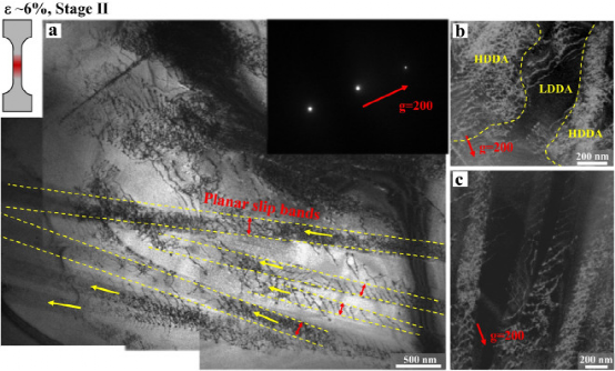 图11所示:M1.5A-LRCCA在Ⅱ阶段应变为~ 6%的变形诱发位错的TEM图像。(a)滑移带由沿主滑移系统滑动并穿过整个晶粒的堆积位错组成。插入图像是对应的SAED图案。(b, c) DF图像显示沿衍射矢量(g)[200]的复杂位错结构。HDDA为高密度位错区。LDDA代表高密度位错区。