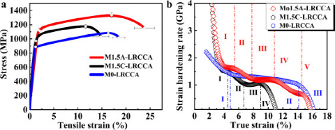 图1所示:M0-LRCCA、M1.5C-LRCCA和M1.5A-LRCCA的室温拉伸性能。(a)真应力-应变曲线。(b)应变硬化率与真应变的函数关系。