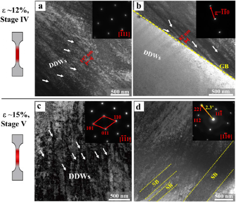 图13所示:M1.5A-LRCCA在应变为~ 12%和~ 15%(Ⅳ和Ⅴ)阶段的变形诱导位错亚结构的TEM图像。(a, b)Ⅳ阶段的DDWs。(c, d)Ⅴ阶段DDWs位错子结构和剪切带(SBs)。插入显示相应SAED模式的图像。