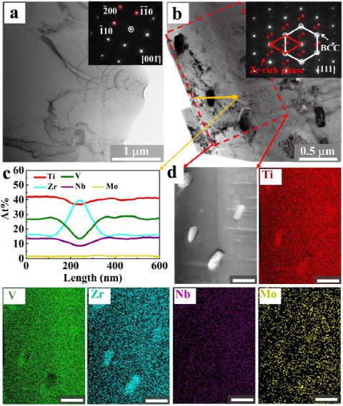图4所示:M0-LRCCA和M1.5A-LRCCA的透射电镜组织。(a) M0-LRCCA单相的BF图像。插入图像显示沿[001]区域的SAED模式。(b) TEM-BF图像显示M1.5A-LRCCA的双相结构。插入显示SAED模式的图像。(c)显示M1.5A-LRCCA中BCC基质和沉淀物的元素分布的STEM-EDS线剖面。(d)显示沉淀物形态的STEM图像。STEM-EDS图谱显示了Ti、V、Zr、Nb和Mo的相应元素分布,比例尺为200 nm。