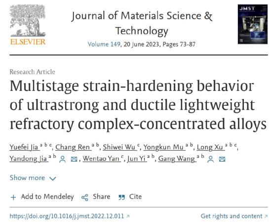 上海大学王刚教授团队对此进行了研究,相关研究成果以题为“Multistage strain-hardening behavior of ultrastrong and ductile lightweight refractory complex-concentrated alloys”发表在期刊Journal of Materials Science& Technology上。