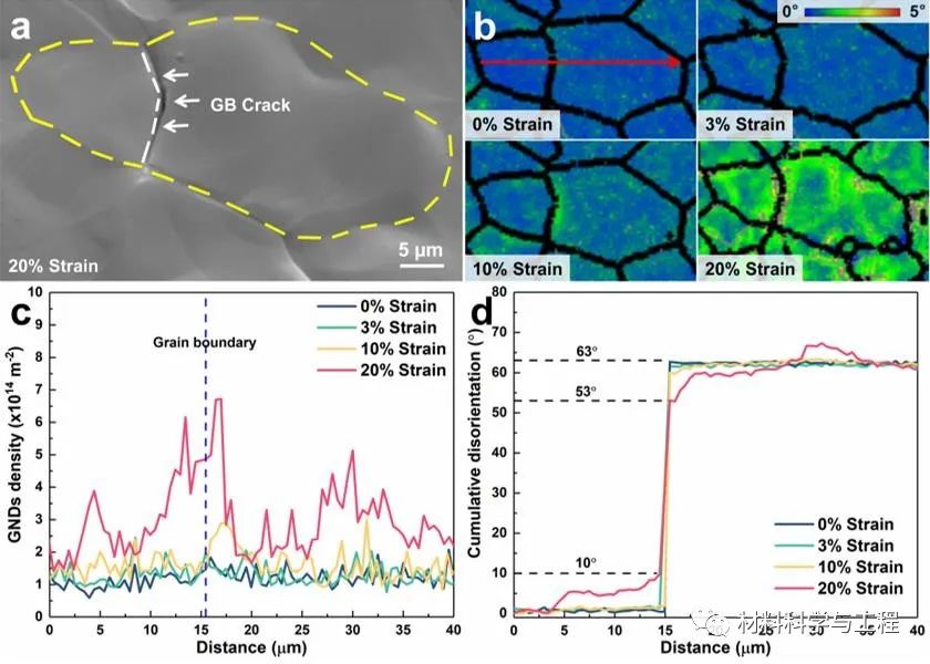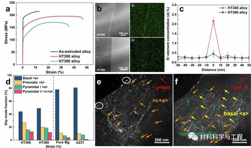 作者利用原位EBSD+SEM滑移迹线分析定性/定量研究了变形模式激活规律,表明Mg-Er合金在中等细化晶粒(8 μm)下能够激活相当多非基面滑移,明显高于对比合金,且非基面滑移的激活也一定程度上抑制了孪生。基于TEM位错柏氏矢量分析原理(g·b=0缺陷不可见原则),利用双束条件下WBDF在拉伸后的退火Mg-Er合金中观察到大量的非基面滑移,这验证了滑移痕迹分析的结果。晶界裂纹是变形过程中难以避免的,晶界处的几何必须位错密度随应变量的增加而增加(图3)。作者利用STEM-HAADF/EDS量化分析不同状态退火的Mg-Er合金的晶界偏聚水平,300 °C下退火合金的晶界偏聚水平明显更高,这利于晶界处的非基面位错激活和抑制晶界开裂,进而获得更高的室温塑性。
