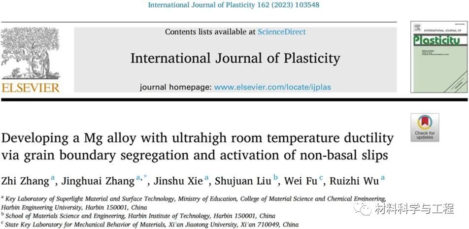 近期,哈尔滨工程大学张景怀课题组综合利用晶界偏聚和高比例非基面滑移激活开发出室温高塑性镁合金。相关论文以“Developing a Mg Alloy with Ultrahigh Room Temperature Ductility via Grain Boundary Segregation and Activation of Non-basal Slips”为题发表于International Journal of Plasticity。哈尔滨工程大学材料科学与化学工程学院博士生张志为论文第一作者,博士生导师张景怀为通讯作者,哈尔滨工程大学为唯一通讯单位。