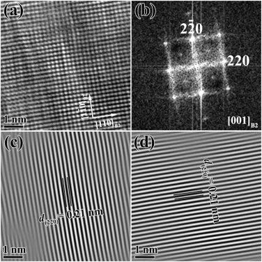 图7所示:局部畸变奥氏体的HR-TEM图像(a)和对应的FFT模式(b)。通过圈出基本反射(220)和()(c),()和()(d)获得的IFFT图像。