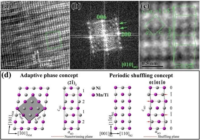 图8所示:6O调制马氏体的红外-透射电镜图像(a)和相应的FFT图(b). (a)中红色矩形的放大视图,其中显示了可能的四方构件和6O单元格(c).基于两种不同调制概念从B2形成6O结构的示意图(d)。
