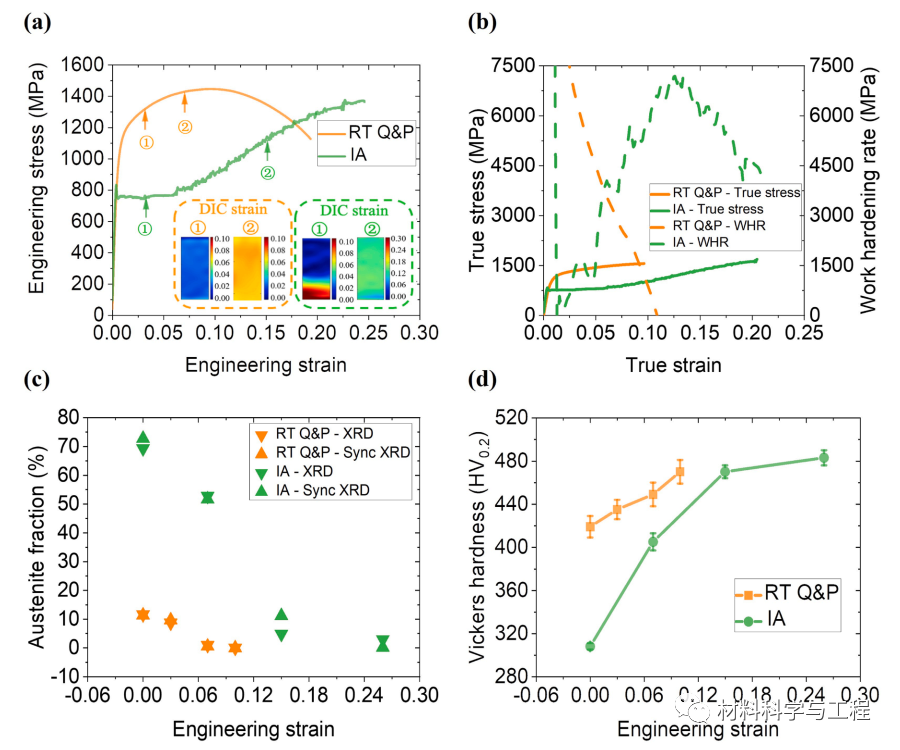 图 3.IA和RT Q&P钢的拉伸行为,(a)工程应力 - 应变曲线,DIC结果在插图中应变。(b)真实应力 - 应变和加工硬化速率曲线。(c)奥氏体部分和(d)拉伸期间的维氏硬度演变。