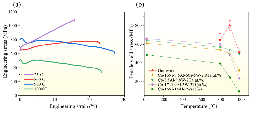 图3. (a)样品在25、800、900和1000°C下测试的工程应力应变曲线。(b)与其他单晶钴基高温合金的屈服强度的比较。