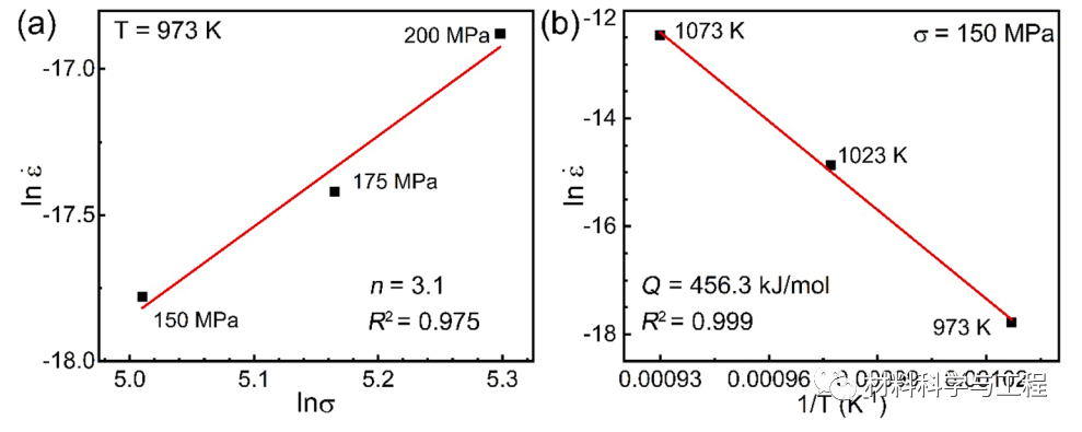 图 3.(a) Ni2Co1Fe1V0.5Mo0.2MEA在973 K处蠕变的稳态蠕变速率与外加应力的自然对数图。(b)在150 MPa恒定应力下样品蠕变的稳态蠕变速率与绝对温度倒数图的自然对数