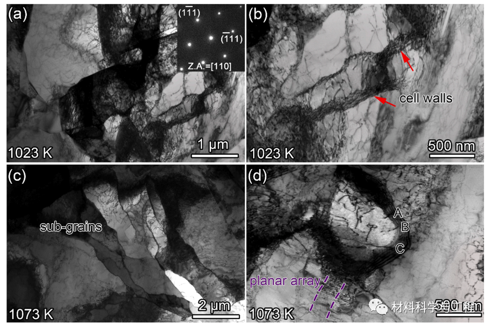 图 5.透射电镜显微照片显示了蠕变变形Ni2Co1Fe1V0.5Mo0.2MEA样品中的微观结构:(a)和(b)1023 K/150 MPa样品中的亚结构和位错晶胞;(c) 和 (d) 1073 K/150 MPa 样品中的亚晶粒、位错单元和平面阵列。