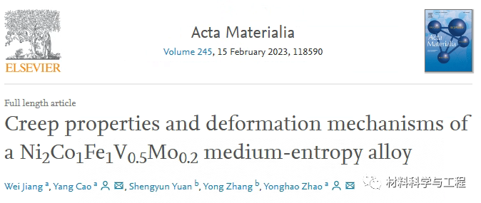 总之,这项工作系统地评估了Ni2Co1Fe1V0.5Mo0.2MEA 中微观结构演变与蠕变性能之间的关系,并将 MEA 归类为 I 类合金家族。虽然粘性位错滑移引起的蠕变的传统 Mohamed-Langdon 准则被证明适用于浓固溶体,例如此处研究的Ni2Co1Fe1V0.5Mo0.2MEA,但应力对速率控制机制的影响需要新的理解,即高应力是主要的粘性位错滑移的驱动因素,但可能间接促进位错攀移。这是因为可以强烈激活应力驱动的点动拖动过程以产生过量的空位,从而促进位错-空位相互作用,从而促进位错攀升。尽管如此,本研究的工作还提供了确凿的证据,表明添加 V和 Mo 的材料设计概念对于通过限制具有高活化能的扩散速率来改善蠕变性能是可行的。本研究的结果很容易用于指导未来高温 MEA 和 HEA 的设计。