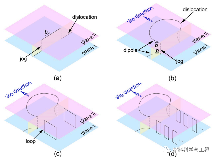 图 7.点动拖动过程的示意图。(a) 在螺位上形成点动;(b) 固定的位错向外弯曲,在固定的点动处产生偶极子;(c) 螺钉位错向前移动并随之拖动点动,同时在路径上形成环;(d) 滑动点动的螺钉位错产生环路.