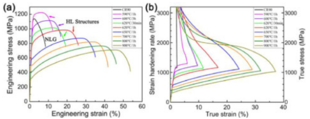 图10 不同条件下Ni2CoFeV0.5 MEAs热机械处理后的拉伸性能(a) 工程应力-应变曲线。(b) 真实应力和应变硬化率与真实应变的比较。NLG:纳米层状颗粒。