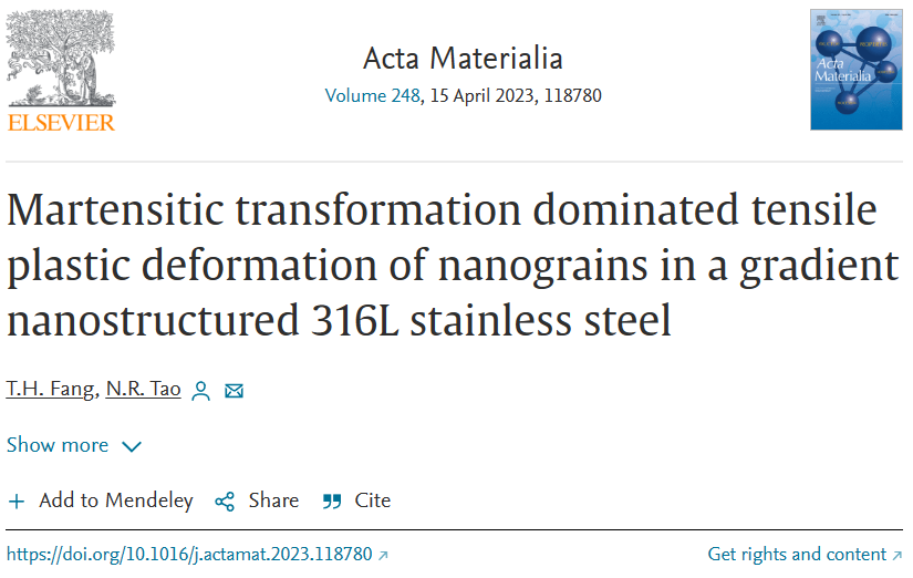 相关研究成果以题“ Martensitic transformation dominated tensile plastic deformation of nanograins in a gradient nanostructured 316L stainless steel”发表在国际期刊Acta Materialia上。
