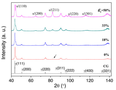 图8 SMGT 316 L SS在张力前后的XRD结果对不同应变进行了变形。采用CG样品进行比较。马氏体峰和奥氏体峰分别用α'和γ索引。