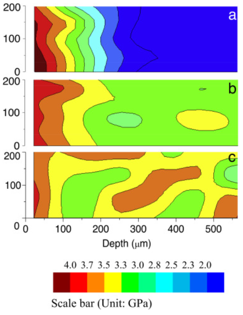 图5 GNG/CG样品的硬度轮廓图(a)拉伸变形前后到各种真实应变:(b)33%和(c)83%。
