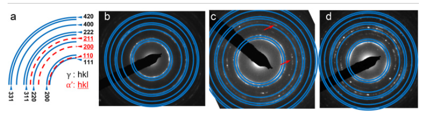 图9(a) 标准奥氏体(固体)和马氏体(虚线)衍射环的图示。重叠的马氏体衍射环被忽略;(乙至四)纳米晶层的衍射图(深度10 μm)在应变为(b)0%时与标准奥氏体衍射图叠加;(c) 50%和(d) 127%。箭头表示马氏体衍射的出现。