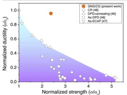 对均质纳米晶材料的研究表明,要实现其拉伸延展性需要满足两个先决条件,一是有效抑制应变局部化,二是存在任何有效的塑性变形机制。受自然界中具有空间梯度的局部化学成分或成分和/或纳米级结构特征的生物材料的启发,这些材料通常表现出强度和韧性的良好结合,空间梯度已被引入金属材料中。对于各种金属材料,梯度晶粒尺寸策略是提高整体机械性能的成功案例之一,例如强度-延展性协同作用和非凡的应变硬化,它们是在具有均匀或随机混合微观结构的材料中无法实现。