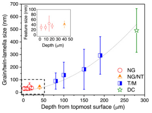 图3 将通过 TEM 观察测量的横向晶粒尺寸和平均孪晶/基质薄片厚度绘制为深度的函数。(NG:纳米晶;NT:纳米孪晶;T/M:孪晶/矩阵;DC:位错晶胞。插图是虚线方块中数据的放大图。)。
